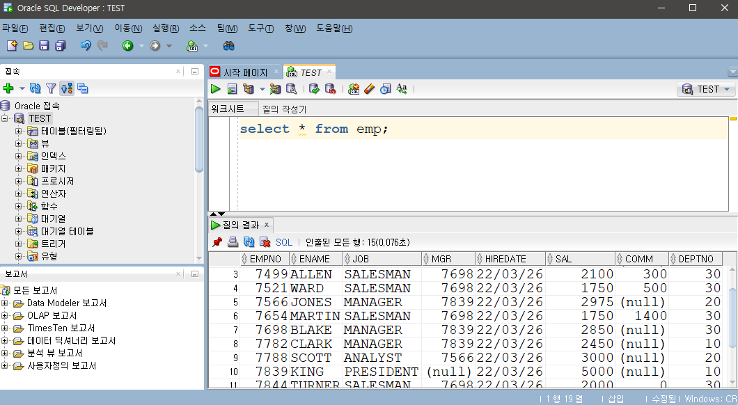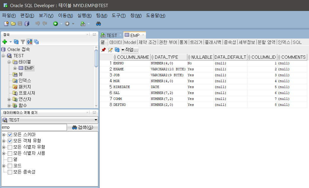 Oracle SQL Developer를 이용하여 생성한 테이블을 조회한 모습입니다.