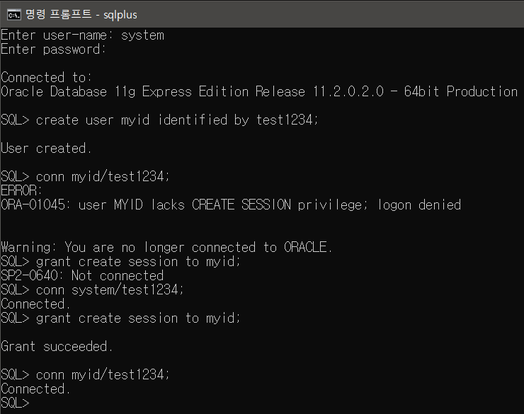 user [아이디] lacks CREATE SESSION privilege; logon denied