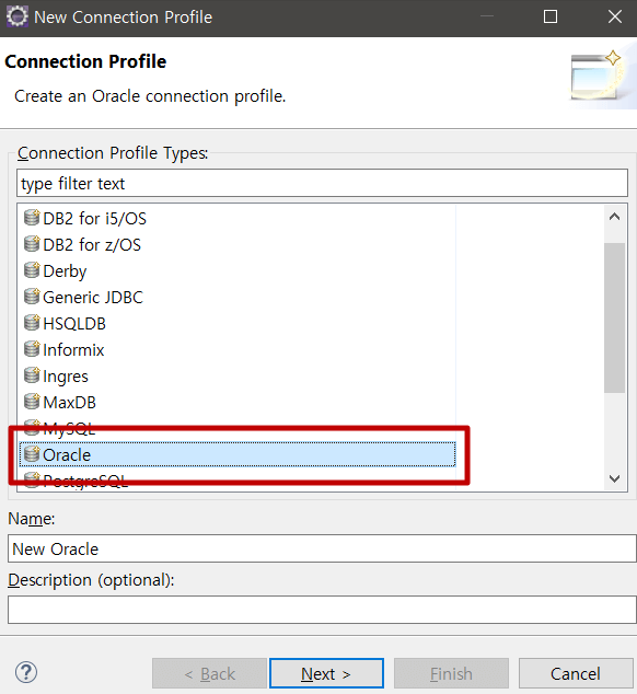 우리는 오라클을 연결할 예정이므로 Oracle을 선택합니다.