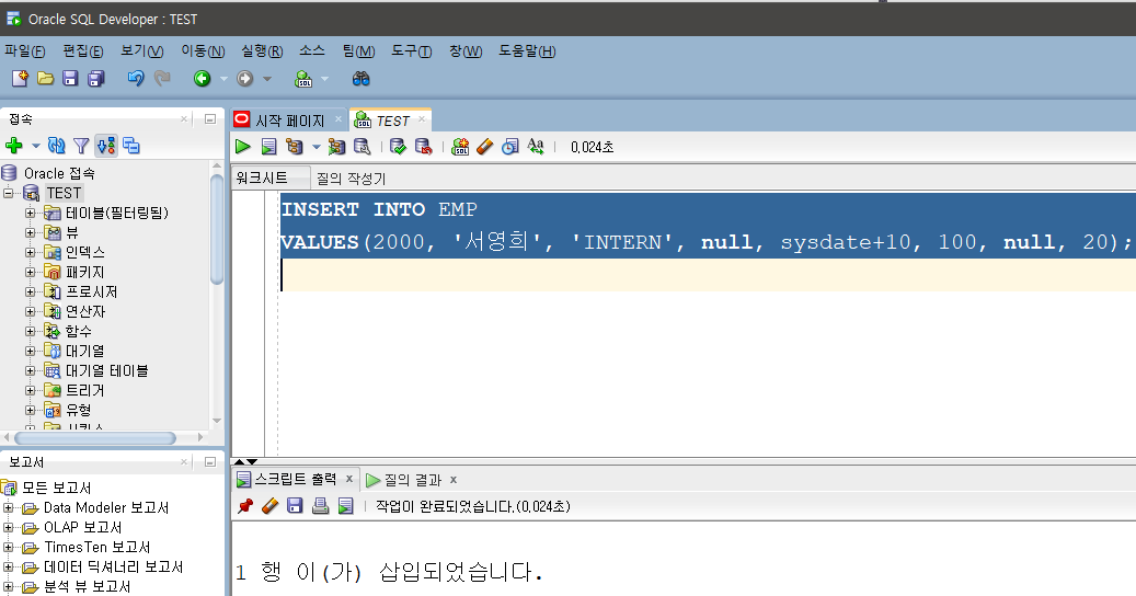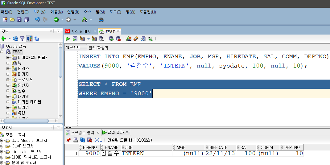 VALUES(9000, '김철수', 'INTERN', null, sysdate, 100, null, 10);
