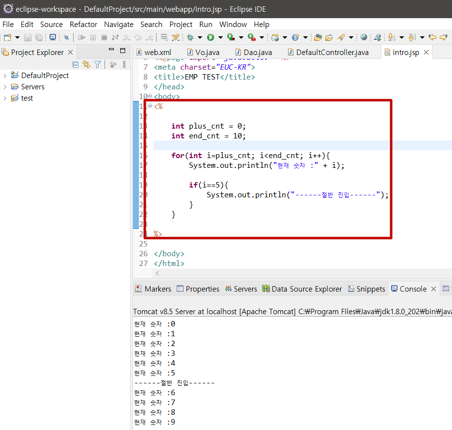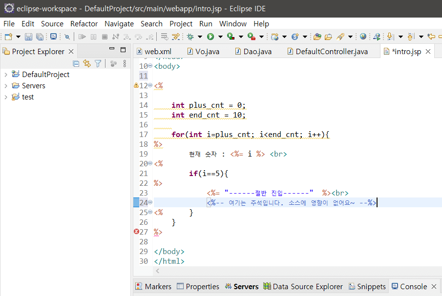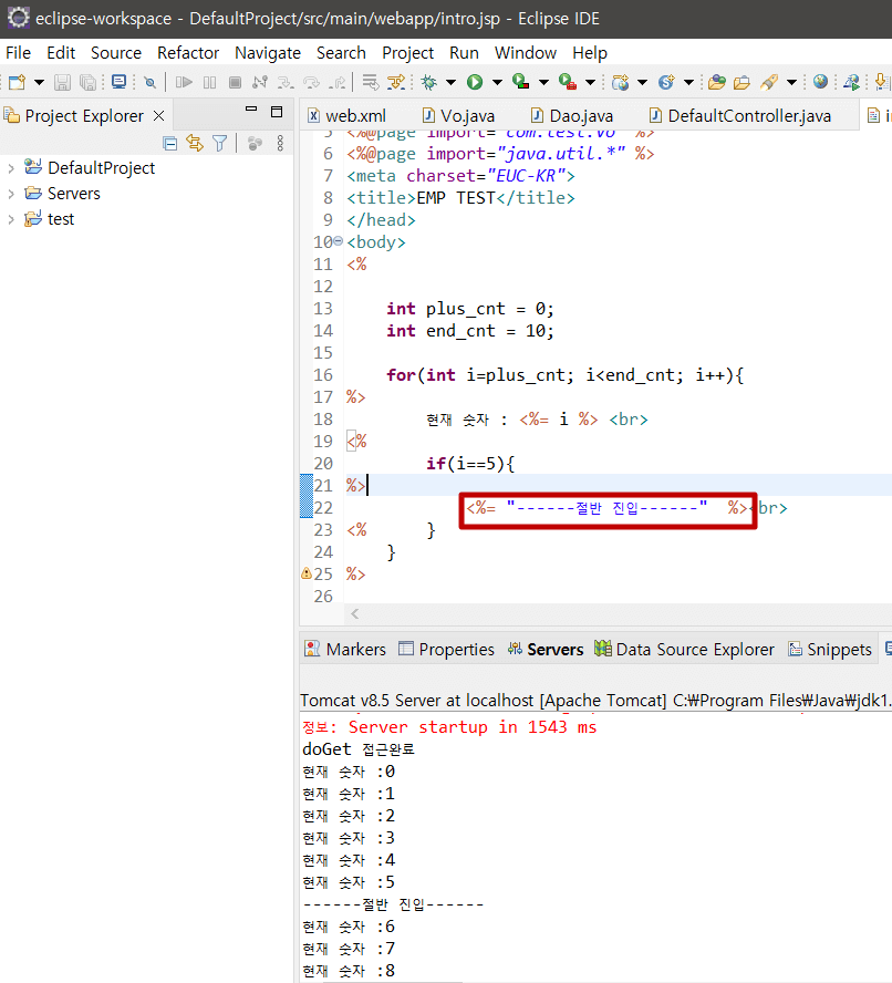 위의 소스는 스크립트릿 태그 부분과 표현 부분을 혼용해서 구성한 소스입니다.