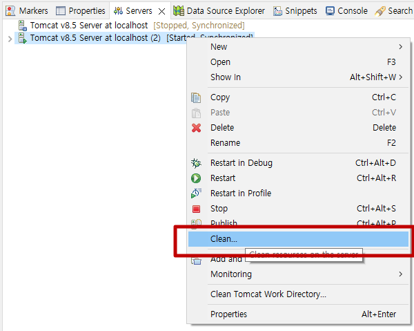 Clean을 통해 톰캣의 리소스를 초기화해 줍니다.