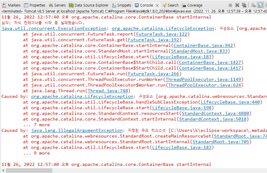 java.util.concurrent.ExecutionException: org.apache.catalina.LifecycleException: 구성요소 [org.apache.catalina.webresources.StandardRoot@64a2d2e9]을(를) 시작하지 못했습니다.