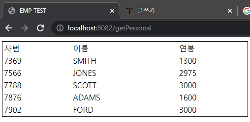 오라클을 연동하여 DB 내 데이터를 Select 하는 예제의 결과값 입니다.