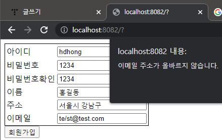 이메일 정규식 체크 로직이 포함되어 있습니다.