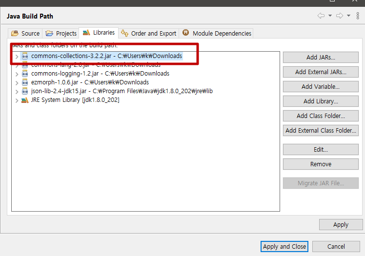 json 프로젝트 진행 중에 ListOrderedMap 클래스가 없다는 에러가 발생하였습니다.