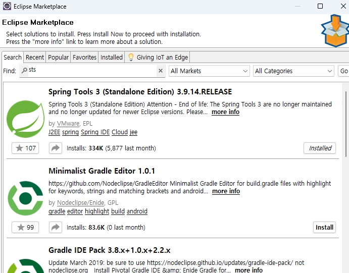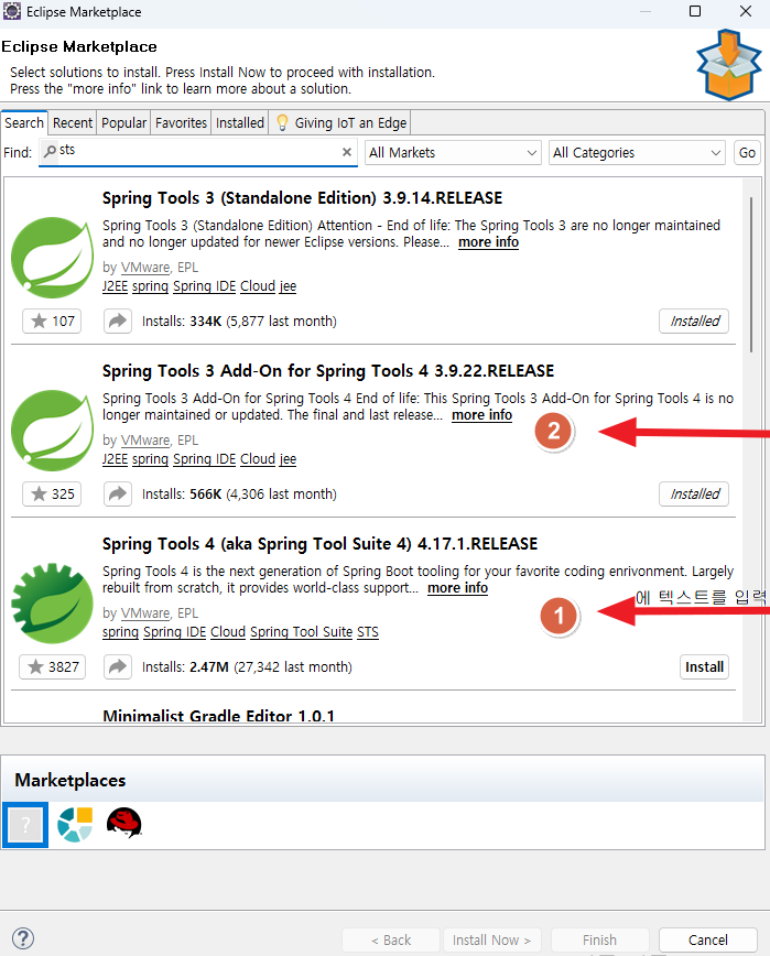 2022-12 버전과 다르게 Spring Tools 3(Standalone Edition)만 검색이 되었습니다.