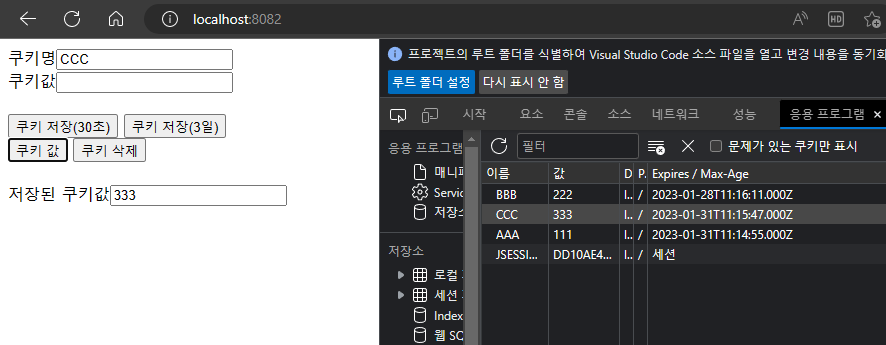 쿠키명과 쿠키값에 각각 데이터를 입력하고