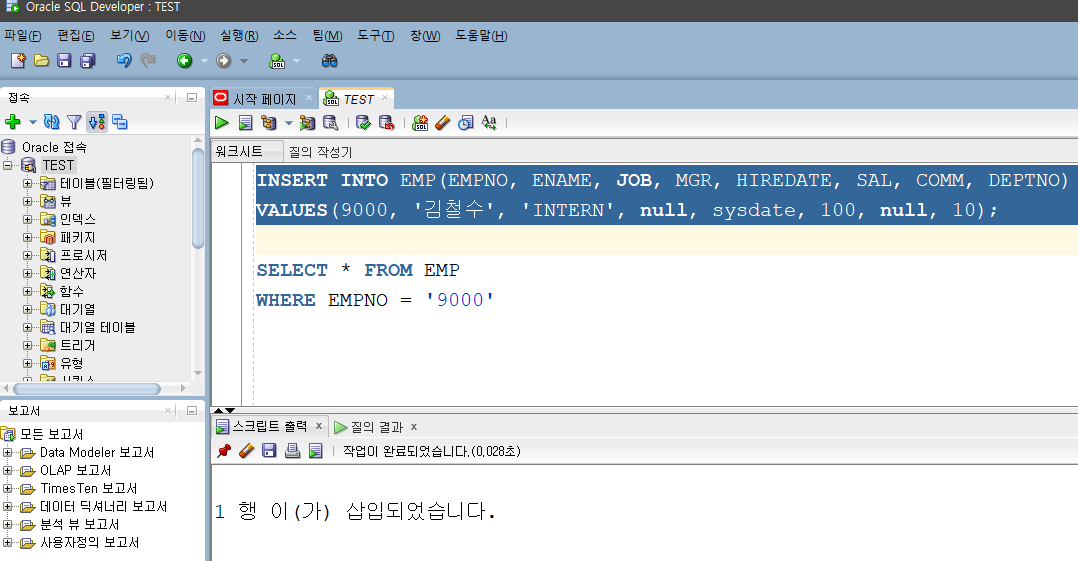 VALUES(9000, '김철수', 'INTERN', null, sysdate, 100, null, 10);