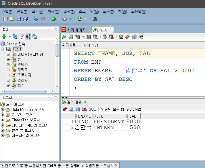 EMP 테이블에서 조회하되 ENAME이 김한국이거나