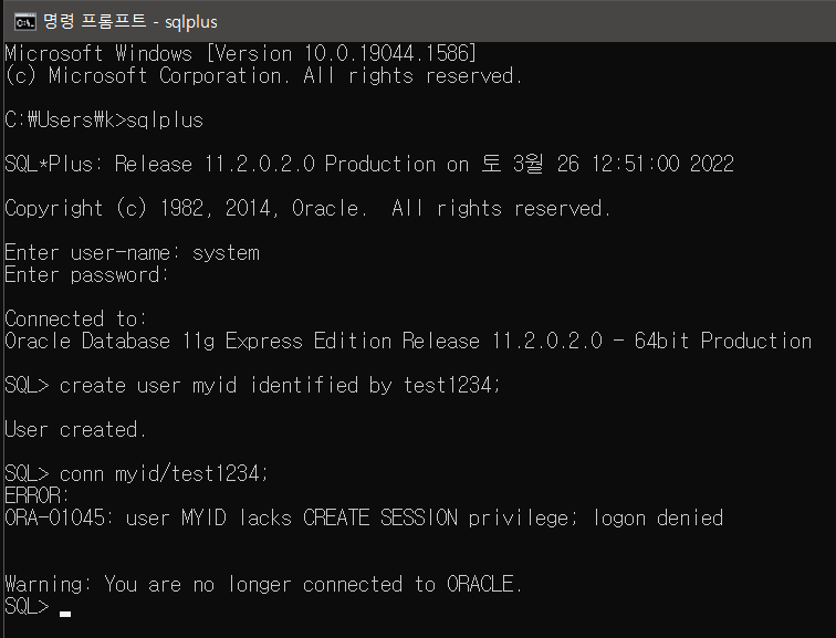 user [아이디] lacks CREATE SESSION privilege; logon denied