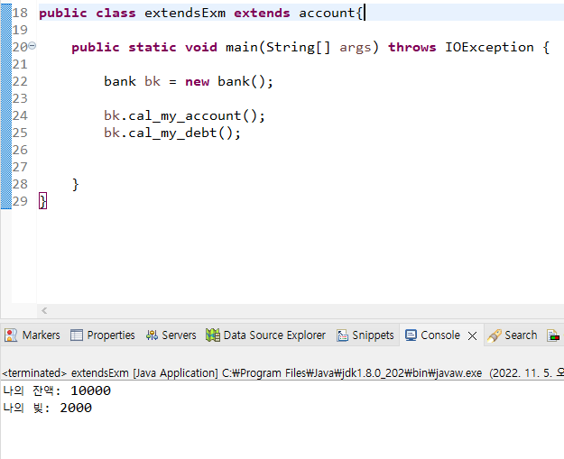 - extendsExm 클래스에서 bank 클래스를 인스턴스화 합니다.