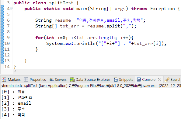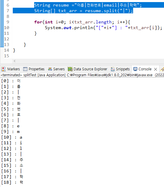 위와 같이 특정 문자열을 담은 변수에 .split("자를 기준")을 지정하면