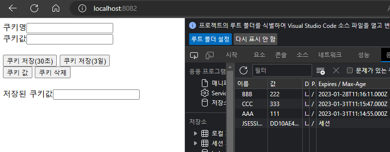 쿠키명과 쿠키값에 각각 데이터를 입력하고