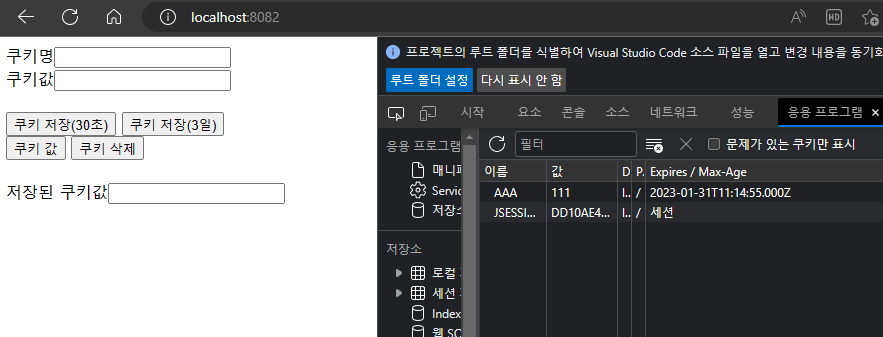 쿠키명과 쿠키값에 각각 데이터를 입력하고