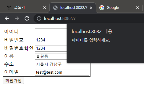 회원가입 시 값이 올바른지 체크하는 유효성 검사 예제를 알아보겠습니다.